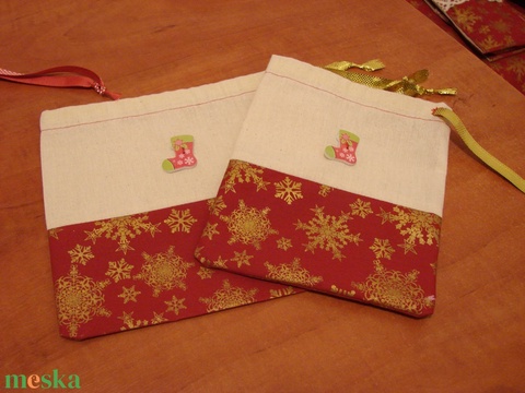 - Anyaga: karácsonyi mintás pamutvászon, natúr vászon, selyem szalag, fa dekoráció