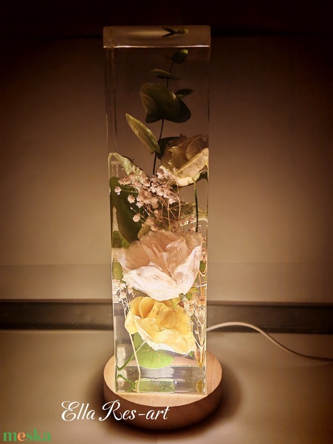 - Anyaga: szárított virág, epoxy gyanta, fa talp led világítással
