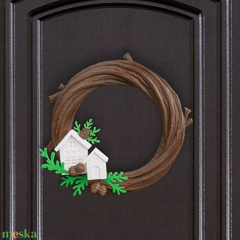 Lépj be a téli mesék világába! Ez a kb. 22 cm-es, valósághű ágkoszorú-utánzat, hófehér, miniatűr házikókkal és tobozokkal díszítve azonnal meghitt, rusztikus hangulatot teremt. A természetes báj és az egyszerű elegancia találkozása a bejáraton.