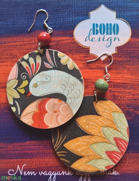 BOHOdesign aszimmetrikus fülbevaló - Színes tollú madár