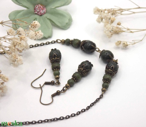 - Anyaga: zöld jáspis, ásványgyöngy, antik bronz gyöngykupak, antik bronz színű lánc, fülbevaló alap