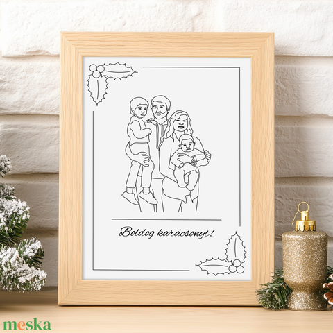 Családi portré karácsonyi keretben - Saját fotó alapján készült vonalrajz (digitális termék)
