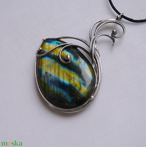A medál Tiffany technikával készült labradorit és ólommentes, ezüsttartalmú ón felhasználásával. A díszítés szintén saját készítésű, nem tartalmaz gyári elemeket. A fémrészt óezüstre patináztam, lekezeltem antioxidánsal és lelakkoztam, hogy sokáig szép maradjon.