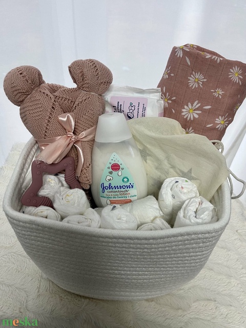 Baba ajándékcsomag fonott kosárban – rózsaszín, lányos összeállítás