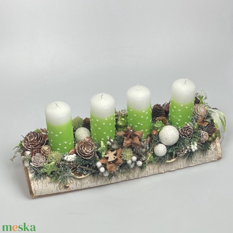 Üde hangulú, zöld-fehér pöttyös hengergyertyás, fahasábon nyugvó, adventi asztaldísz (AW18)