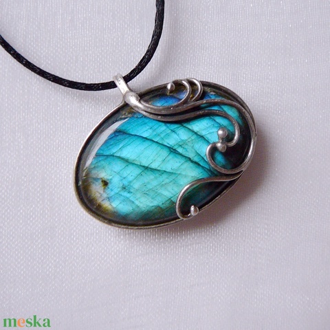 A medál Tiffany technikával készült labradorit és ólommentes, ezüsttartalmú ón felhasználásával. A díszítés szintén saját készítésű, nem tartalmaz gyári elemeket. A fémrészt óezüstre patináztam, lekezeltem antioxidánsal és lelakkoztam, hogy sokáig szép maradjon.