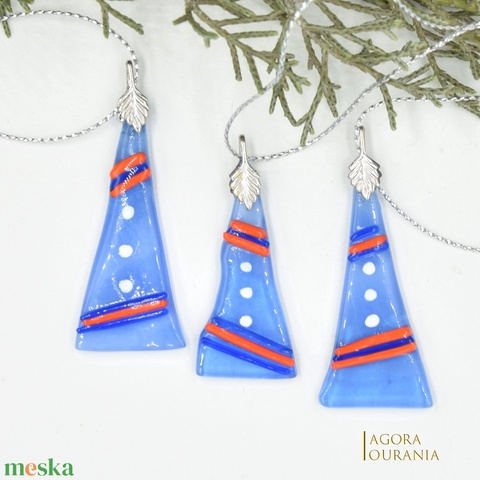 - Anyaga: kék áttetsző üveg, piros és kék üvegspagetti, fehér üvegfesték, fém szerelék, ezüst színű fényes zsinór