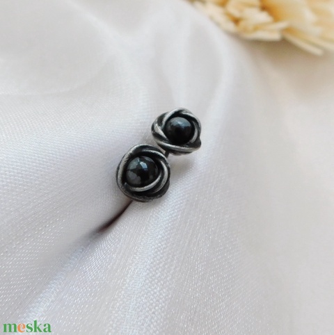 A fülbevaló tiffany technikával készült ólommentes, ezüsttartalmú ón, réz és hópehely obszidián felhasználásával. A díszítés szintén saját készítésű, nem tartalmaz gyári elemeket. A díszítés szintén saját készítésű, nem tartalmaz gyári elemeket.A fémrészt óezüstre patináztam és lelakkoztam, hogy sokáig szép maradjon.