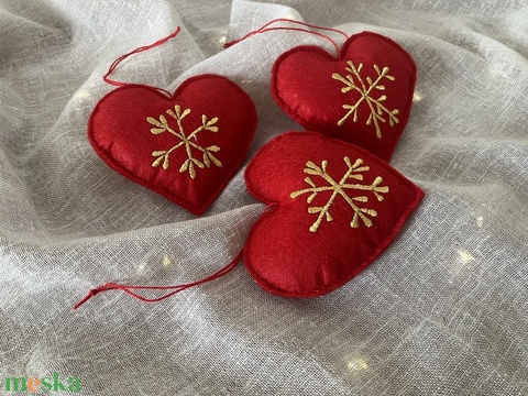 3 db Hímzett szív karácsonyfadísz – piros textilfilc, arany hímzéssel
