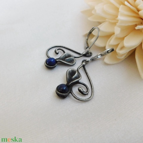 A fülbevaló tiffany technikával készült ólommentes, ezüsttartalmú ón, réz és lápisz lazuli felhasználásával. A díszítés szintén saját készítésű, nem tartalmaz gyári elemeket. A díszítés szintén saját készítésű, nem tartalmaz gyári elemeket.A fémrészt óezüstre patináztam és lelakkoztam, hogy sokáig szép maradjon.