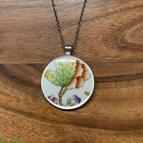 Herendi mentett darabok - nemesacél nyaklánc virágos porcelánnal, nagy medál