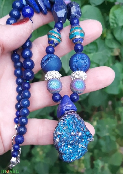 - Anyaga: chilei kalkopirit, lapis lazuli, achát, üveggyöngy, damil, fém szerelékek