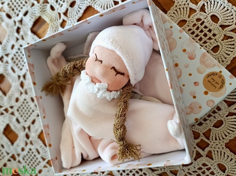 Babaköszöntő ajándék díszdobozban Waldorf típusú rongyibabával