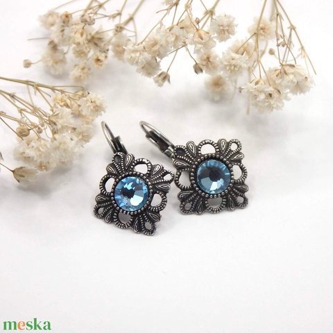 Világoskék Swarovski kristályos, egyedi készítésú, szirmokkal áttört rombusz alakú fülbevaló – Tengerfény