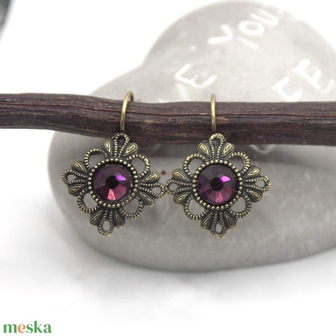 Sötét ametiszt színű Swarovski kristályos, egyedi készítésú, szirmokkal áttört rombusz alakú fülbevaló - Bársony