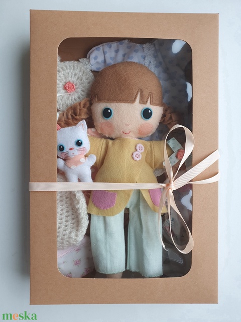 Vivi- öltöztethető textilbaba kis cicával és kiegészítőkkel díszdobozban(Azonnal vihető!)