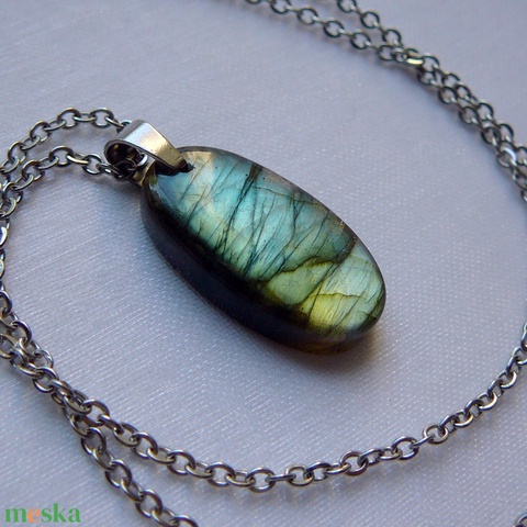 Orvosi acél szerelékre akasztottam ezt a különlegesen szép labradorit medált.