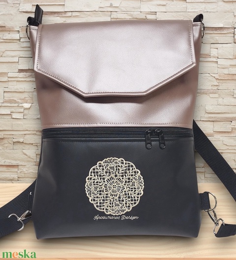 Hímzett csipke mandalás fedélrészes 3in1 hátizsák univerzális táska fekete-púder