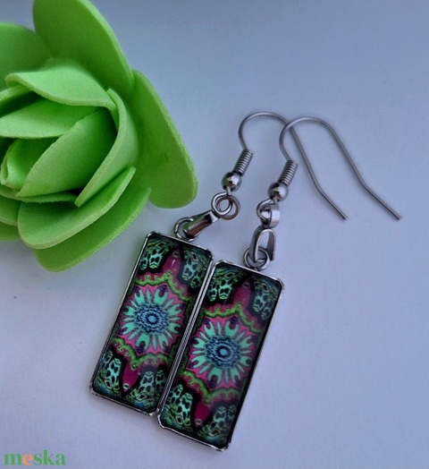 Vibráló Zöld-Rózsaszín Mandala Stílusú Fülbevaló (Futurisztikus Mintával)
