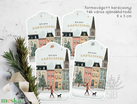 Karácsonyi ajándékkísérő, téli városi kutya mintás formavágott ajándékátadó címke