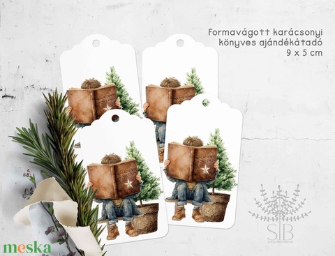 Karácsonyi ajándékkísérő, könyv mintás formavágott ajándékátadó címke