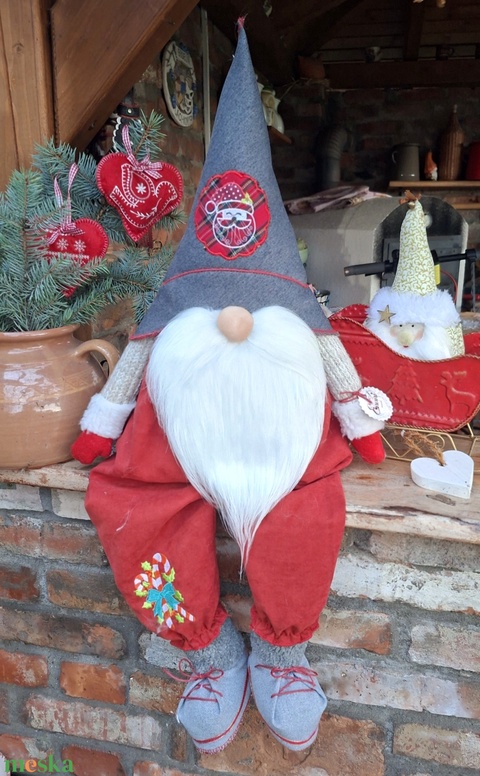 - Anyaga: pamutvászonkockás szövet, töltőanyag, kárpit textil, juta madzag, fából készült gomb, manószakáll