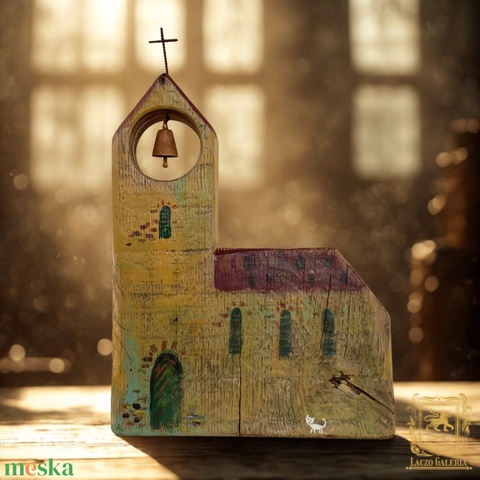 Templom fehér cicával - Antik tölgyfa - Egyedi dekoráció, ajándék ötlet, Gyerekszoba, Karácsony, Kiscica, Harang
