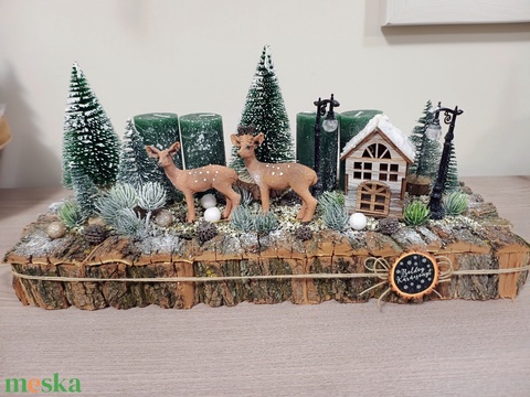 Háncs alapban őzike figurákkal zöld és barna színvilágban karácsonyi ünnepi adventi asztaldísz