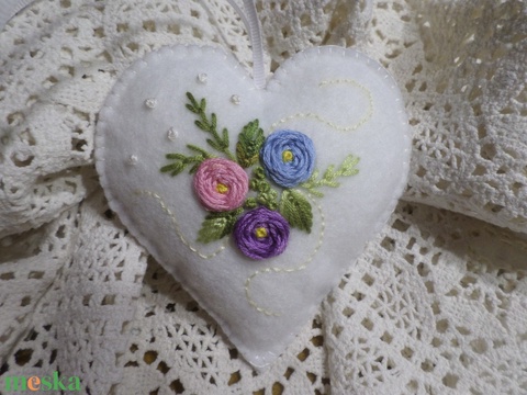 Hófehér hímzett virágos gyapjú filc szív.