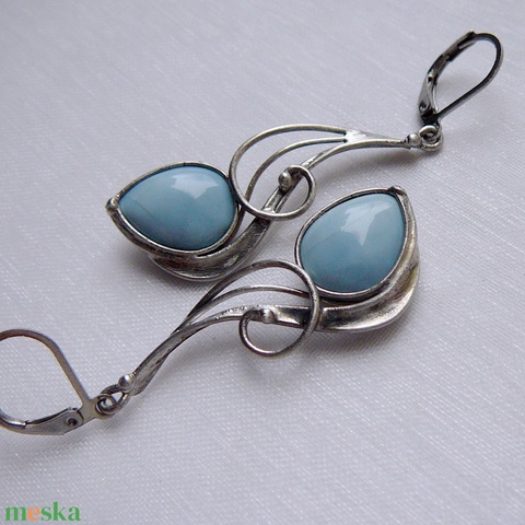 A fülbevaló Tiffany technikával készült kék opál és ólommentes, ezüsttartalmú ón felhasználásával. A díszítés szintén saját készítésű, nem tartalmaz gyári elemeket. A fémrészt óezüstre patináztam és lelakkoztam, hogy sokáig szép maradjon.