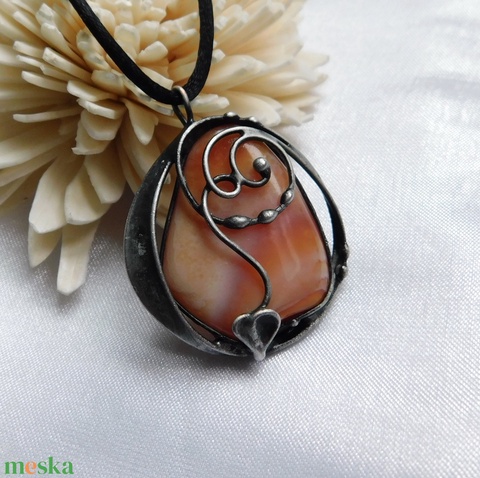 A medál tiffany technikával készült karneol, réz és ólommentes, ezüsttartalmú ón felhasználásával. A díszítés szintén saját készítésű, nem tartalmaz gyári elemeket.A fémrészt óezüstre patináztam és lelakkoztam, hogy sokáig szép maradjon.