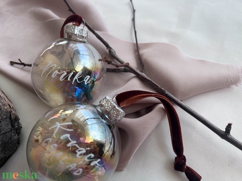 Átlátszó karácsonyi gömb szárazvirággal, névre írva