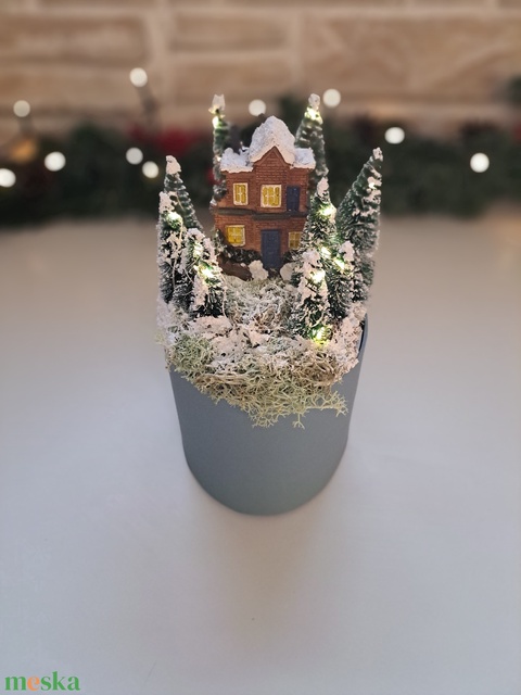 - Anyaga: kartondoboz, kőházikó, oázis, moha, műfenyő, hópaszta, led-es égősor