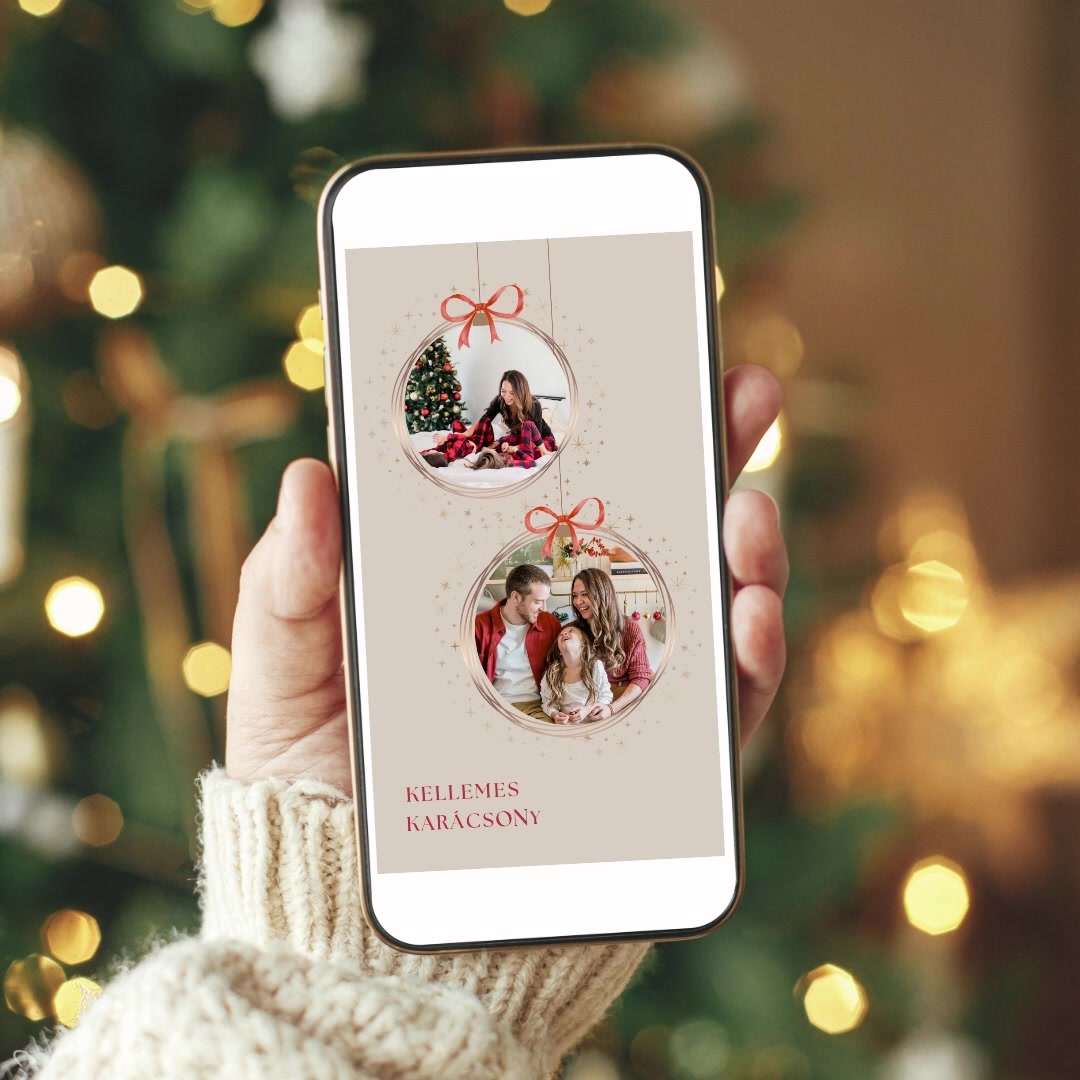 A személyre szabható természetes sablonok teljesen szerkeszthetők, így könnyedén saját fényképekkel és üzenetekkel tölthetők fel. Akár egy kedves családi kép, akár egy ünnepi fotósorozat kerül bele, a gömbdíszes elrendezés esztétikus karácsonyi grafikát alkot, amely gyönyörűen mutat a közösségi média platformokon (Instagram, TikTok, Facebook), de mobiltelefon üzenetben is küldhető.