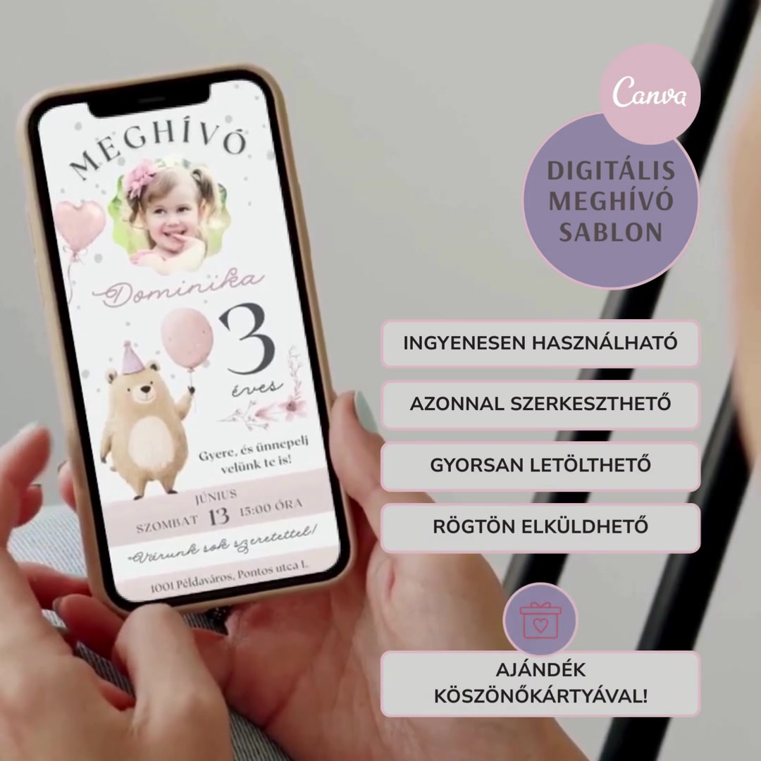 Digitális születésnapi meghívó Canva sablon - Manci maci - Szerkeszthető - Online küldhető - Nyomtatható - Mackós, macis