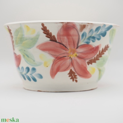 Korongozott, piros virágmintával díszített kerámia tál metszett levelekkel
