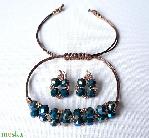 Sötétzöld csiszolt üveg, viaszolt zsinóros karkötő + fülbevaló szett