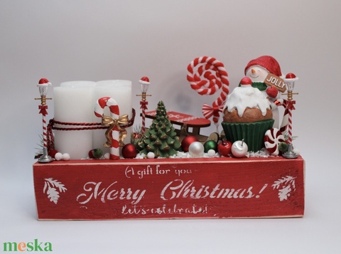 - Anyaga: kerámia figura, karacsonyi gömb, száraz termések, dekorláda