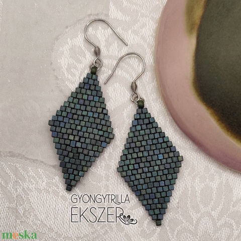 Matt irizáló zöld gyöngyfűzött rombusz fülbevaló