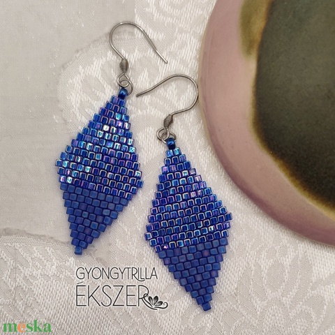 Matt és fényes irizáló kék gyöngyfűzött rombusz fülbevaló