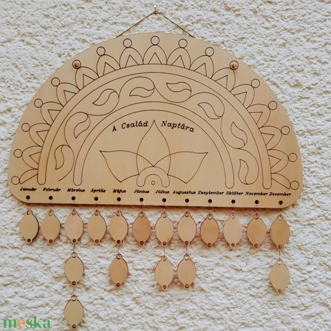 A naptár a képen látható mintájával, natúr színével azonnal díszítheti otthonunkat, de ki is festhetjük akril festékkel vagy akár temperával, hogy hangulatunkat, ízlésünket tükrözve lakásunk dekorációja legyen vagy ajándék valaki számára.