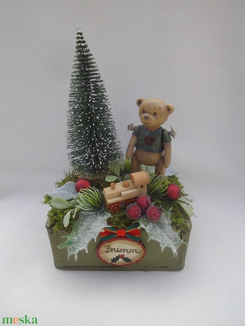 oázis, ragasztó, műzöldek, fadoboz, maci, fenyő, bogyók, üveggömb, moha, kisvonat