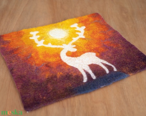 Egyedi, nemezelt kép szarvas / gímszarvas motívummal, vörös-sárga naplemente árnyalatokban