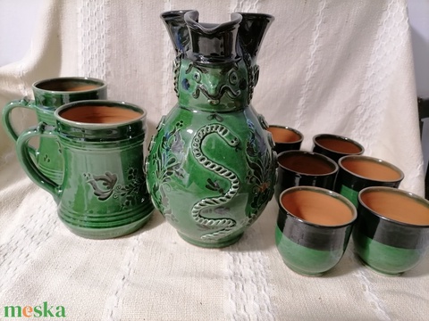 vörösre égő agyag, mangánoxidos engób, színtelen ólommentes máz, zöld ólommentes máz