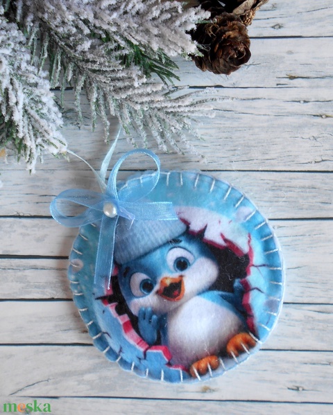 3D hatású 8 cm átmérőjű, kör alakú karácsonyfa dísz (cuki kék madárkás)