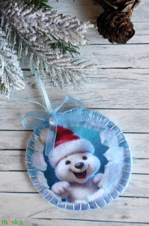 3D hatású 8 cm átmérőjű, kör alakú karácsonyfa dísz (cuki jegesmacis télapósapkában)