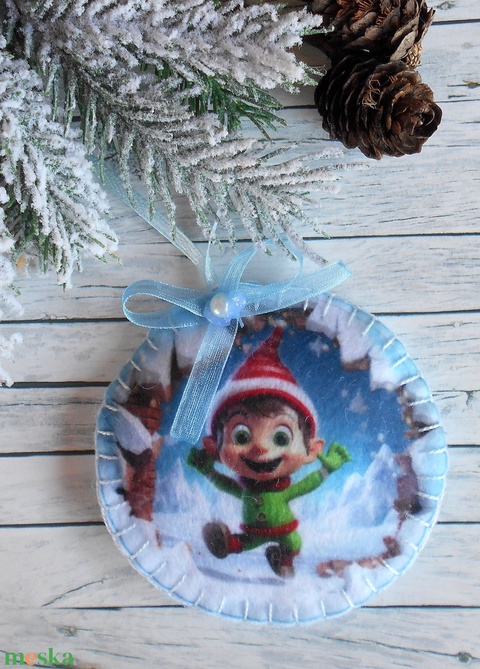 3D hatású 8 cm átmérőjű, kör alakú karácsonyfa dísz (vidám manós)