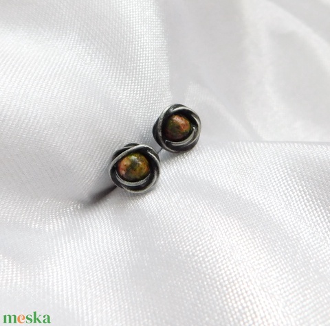 A fülbevaló tiffany technikával készült ólommentes, ezüsttartalmú ón, réz és unakit felhasználásával. A díszítés szintén saját készítésű, nem tartalmaz gyári elemeket. A díszítés szintén saját készítésű, nem tartalmaz gyári elemeket.A fémrészt óezüstre patináztam és lelakkoztam, hogy sokáig szép maradjon.