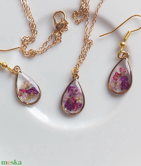- Anyaga: ékszergyanta, préselt virágok, aranyszínű ékszerkeret, aranyszínű nemesacél lánc és akasztók