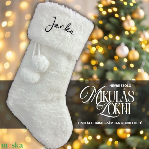 Fehér plüss mikulás zokni - névre szóló, feliratozott, neves